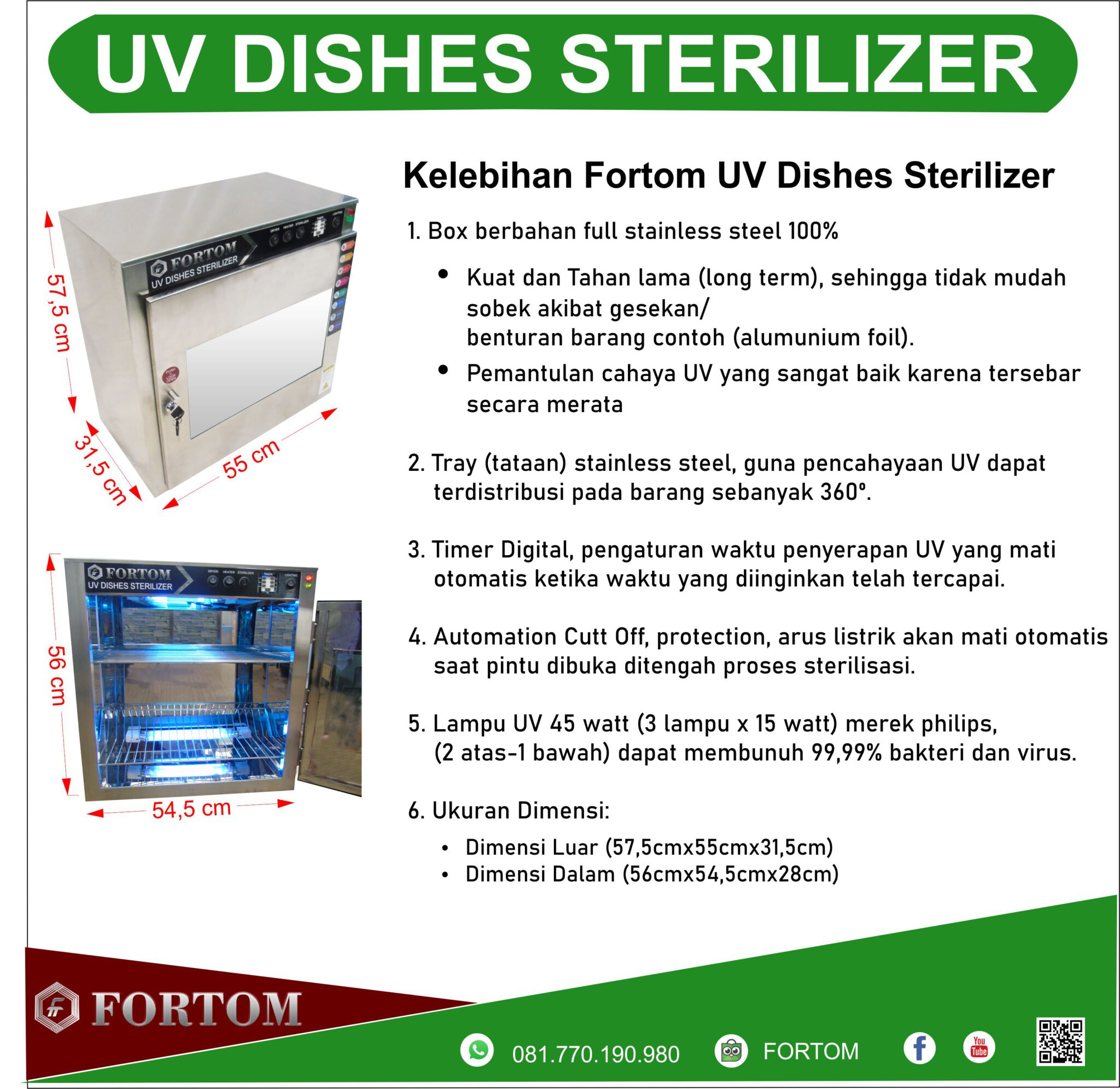 * Bahan full stainless, sehingga pemantulan cahaya sinar UVC terhadap obyek barang terjadi 360 derajat.
